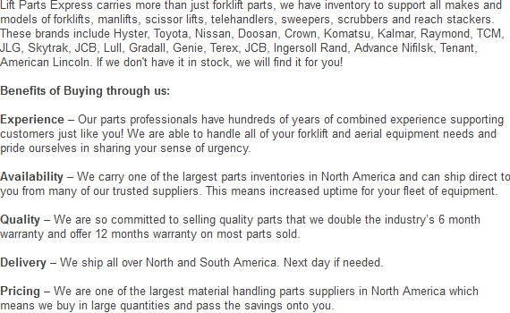 All our lift truck parts are offered at the best prices. For a price estimate on an attachment or part we offer, please contact us at: